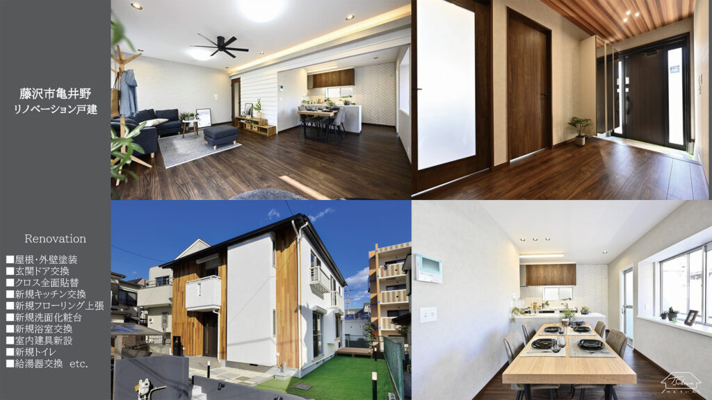 Renovation ■屋根・外壁塗装 ■玄関ドア交換 ■クロス全面貼替 ■新規キッチン交換 ■新規フローリング上張 ■新規洗面化粧台 ■新規浴室交換 ■室内建具新設 ■新規トイレ ■給湯器交換etc.